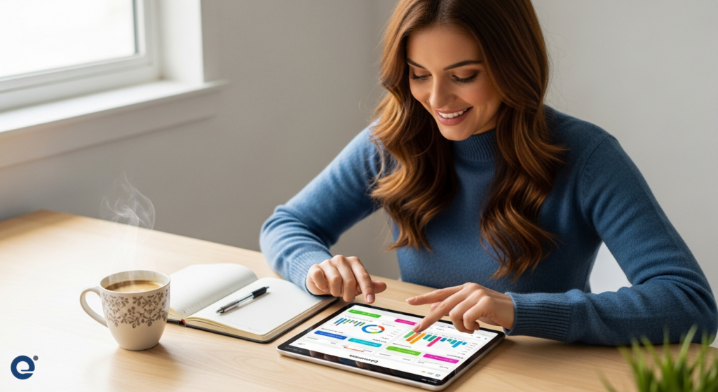 A young woman sits at a clean desk, smiling as she easily navigates a colorful budgeting app on her tablet, with a cup of coffee and a notebook beside her.
