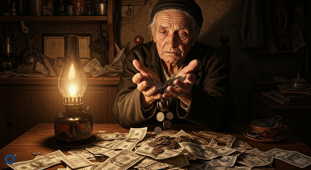 A person watches as coins slowly slip through their fingers, symbolizing the diminishing value of savings due to inflation.