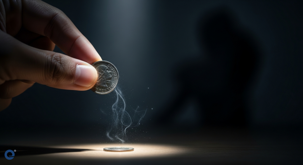 A person watches as coins slowly slip through their fingers, symbolizing the diminishing value of savings due to inflation.