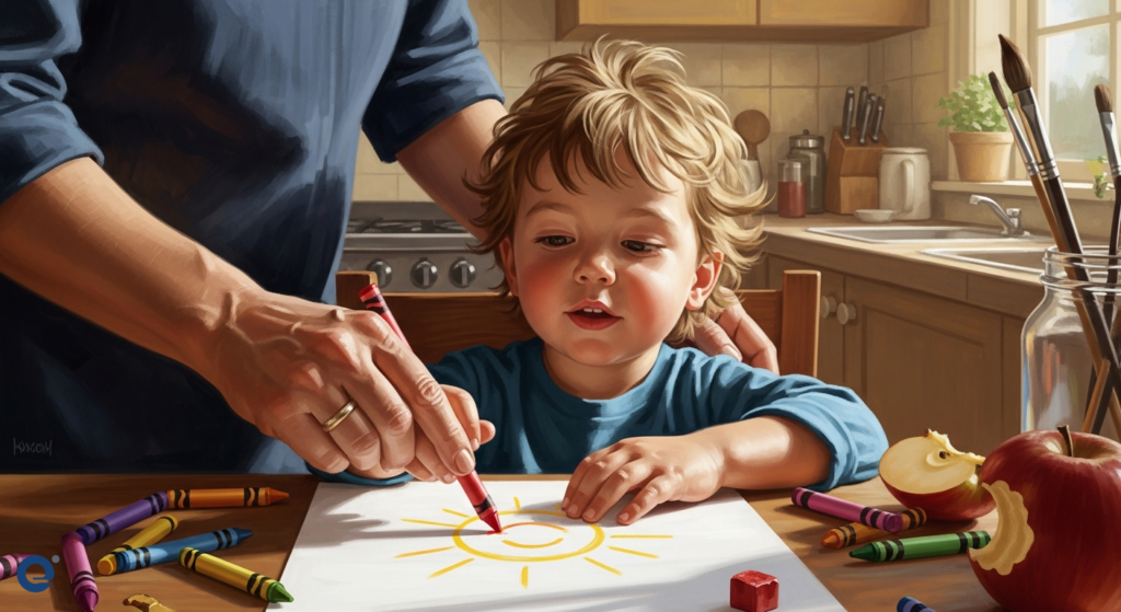 A gentle hand guides a child’s crayon, illustrating the invaluable care provided by a stay-at-home parent.