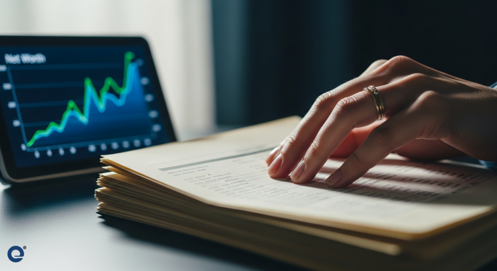 A meticulous hand sorts through stacks of financial statements, with a digital display showing a rising net worth graph in the background.