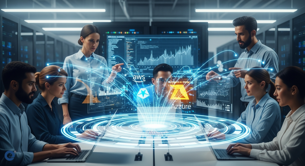 A diverse team of cloud engineers collaborating around a holographic dashboard, with glowing lines of data representing AWS and Azure services flowing between them, indicating coordinated cost optimization efforts.
