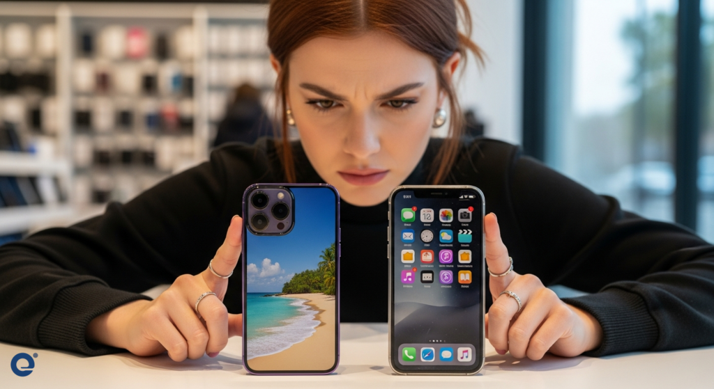 A consumer carefully examines two smartphones, one new and one slightly older, pondering the value proposition.