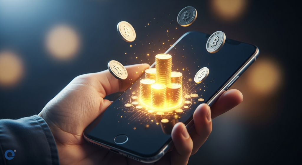 A person’s hand is shown holding a smartphone displaying a vibrant e-wallet app interface, with glowing cashback icons floating around it.