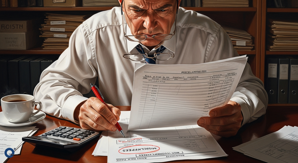 A meticulous accountant scrutinizes a detailed financial statement, highlighting a problematic fee with a red pen.