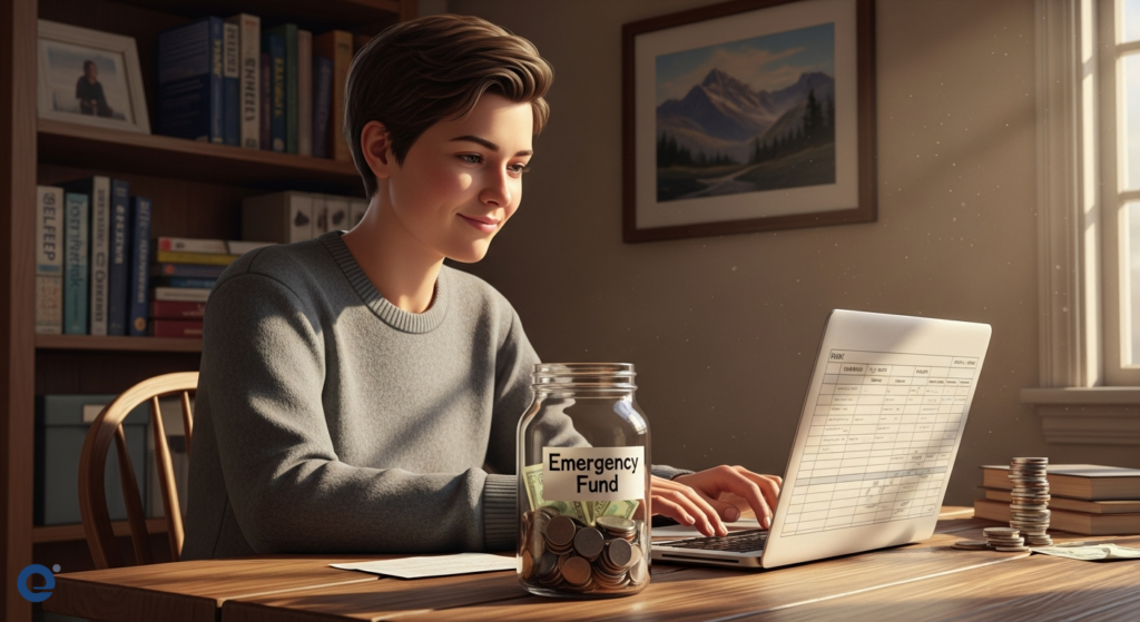 A person calmly reviews their budget, a small emergency fund growing steadily in their savings account.