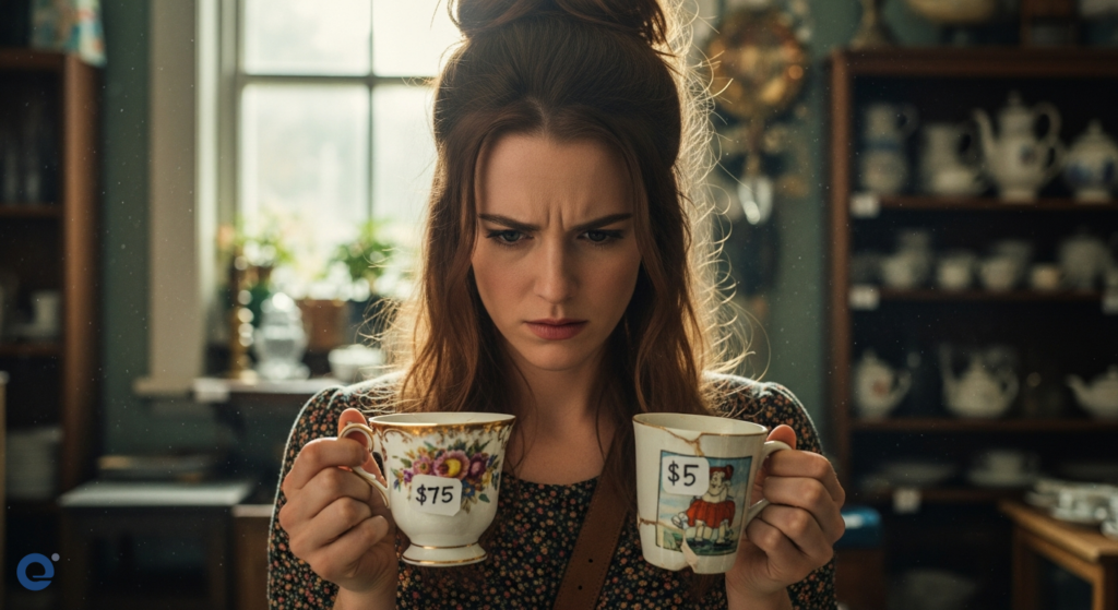 A person thoughtfully comparing two items, one clearly higher quality but more expensive, the other cheap and flimsy, with a thoughtful expression.