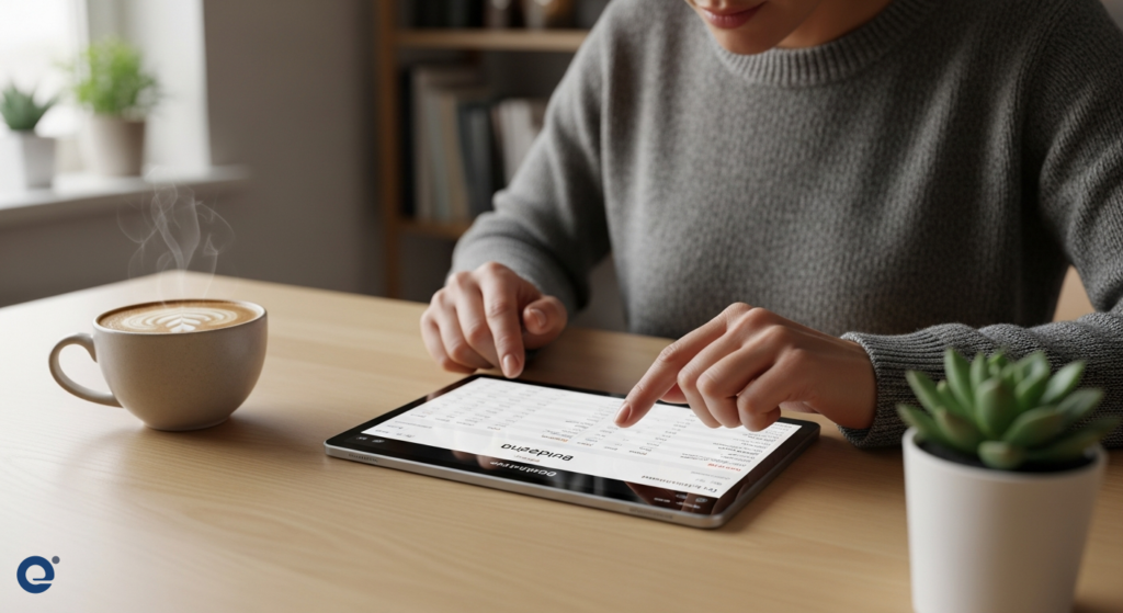 A person meticulously tracking expenses on a digital tablet, with a coffee cup and a small plant beside them.