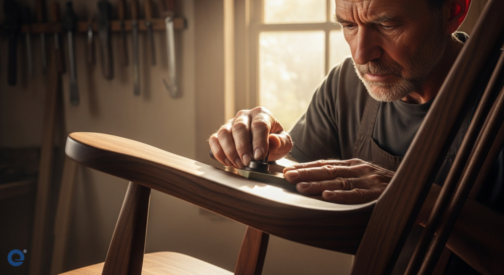A craftsman meticulously polishes a handcrafted wooden chair, highlighting the enduring quality of well-made furniture.