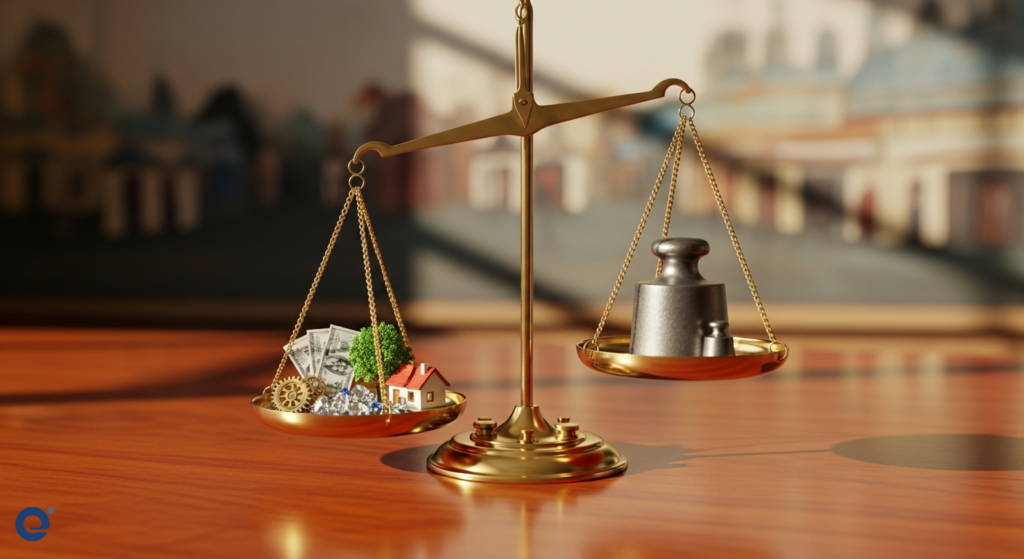 A balanced scale tips slightly towards a stack of diverse assets, representing the optimal diversification ratio.