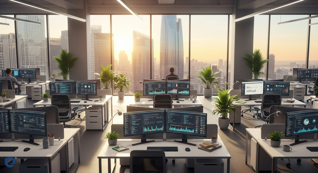 A modern tech office with sleek desks and multiple monitors, symbolizing innovation and growth.