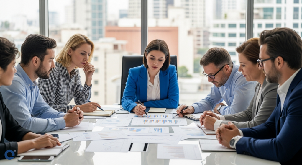 A diverse group of business professionals collaborating around a table, analyzing charts and graphs.