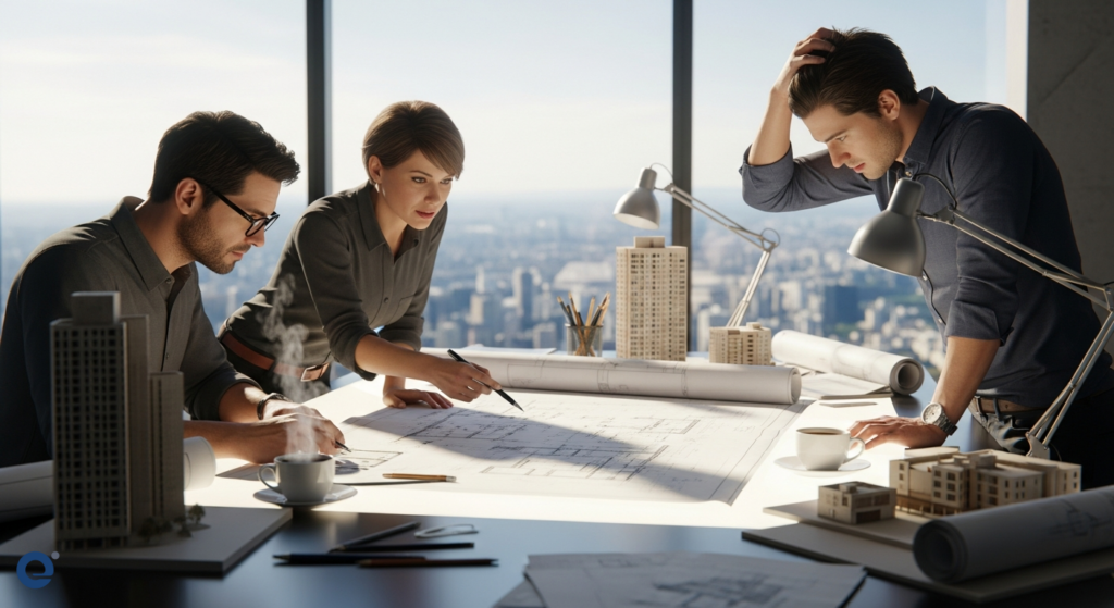 Architects meticulously review blueprints, symbolizing the detailed planning required for custom software development.