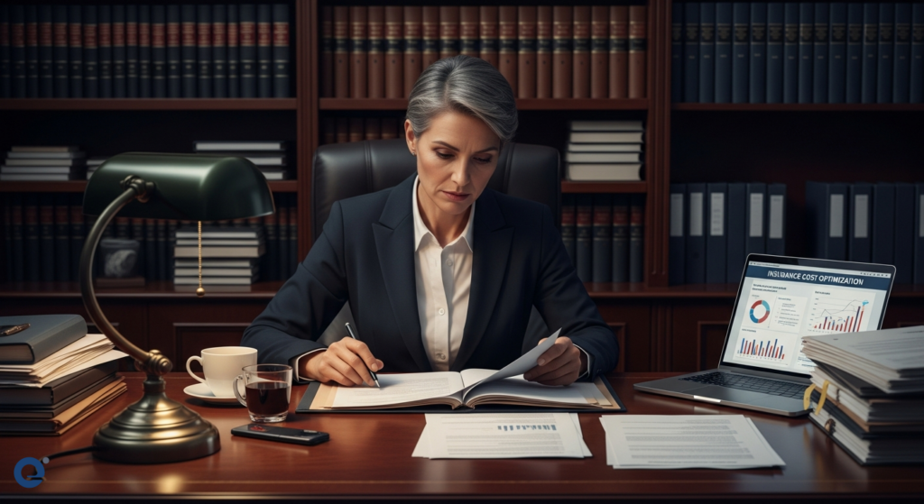 A meticulous risk manager reviewing policy documents, surrounded by charts and data, symbolizing the strategic approach to insurance cost optimization.