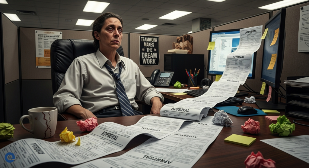 A manager sighs as a long queue of approval forms stretches endlessly before them.