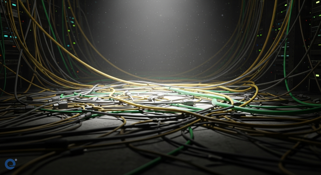 A lone spotlight illuminates a tangled web of cables, symbolizing the hidden complexities of unauthorized software.