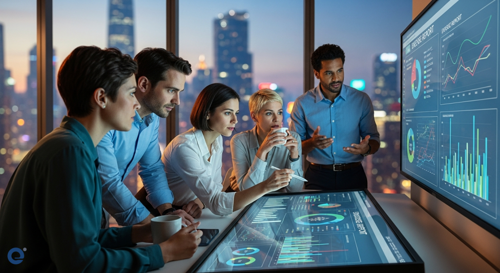 Team members analyze expense reports on a digital platform, showcasing real-time data visualization.