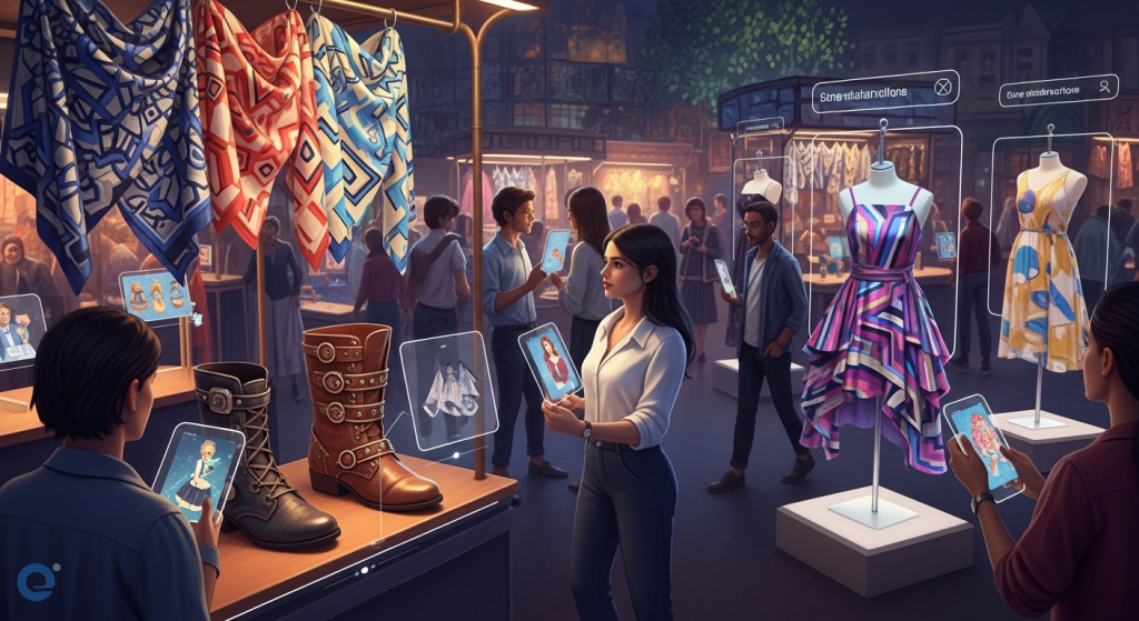 A vibrant digital marketplace buzzing with diverse fashion items and eager buyers.
