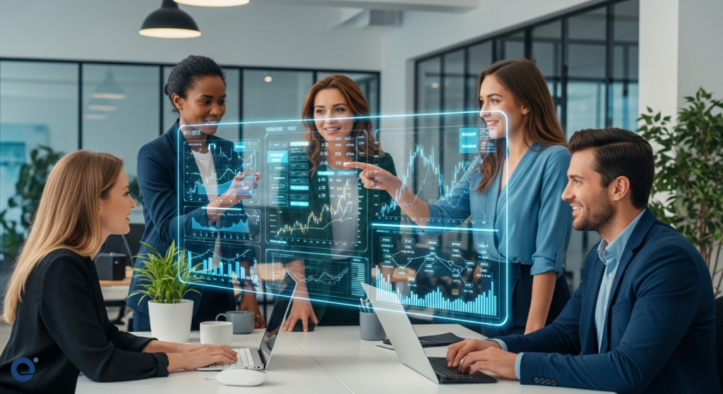 A diverse team collaborating around a transparent dashboard, showcasing financial data and IT infrastructure metrics.