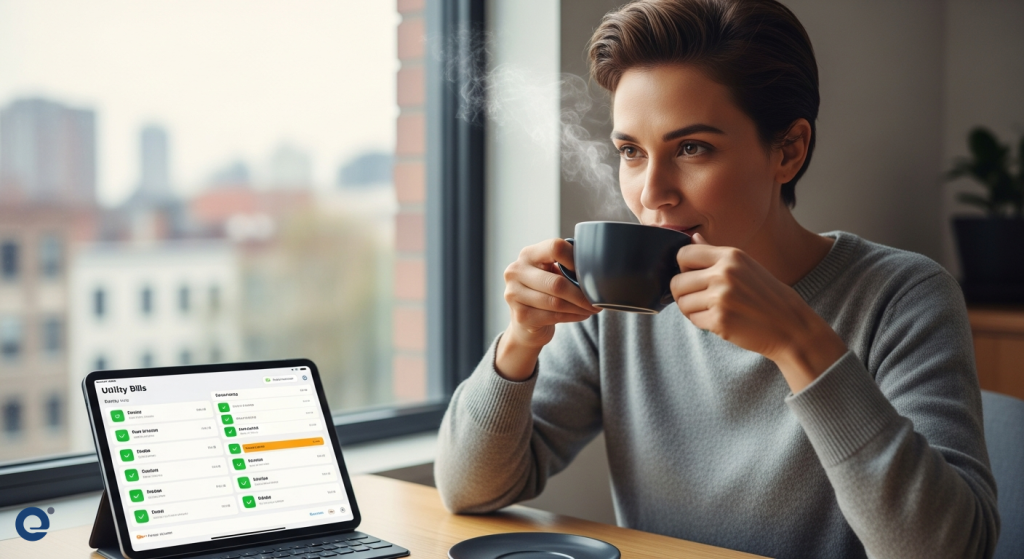 A person calmly sipping coffee while their tablet displays a dashboard of paid bills and upcoming due dates.