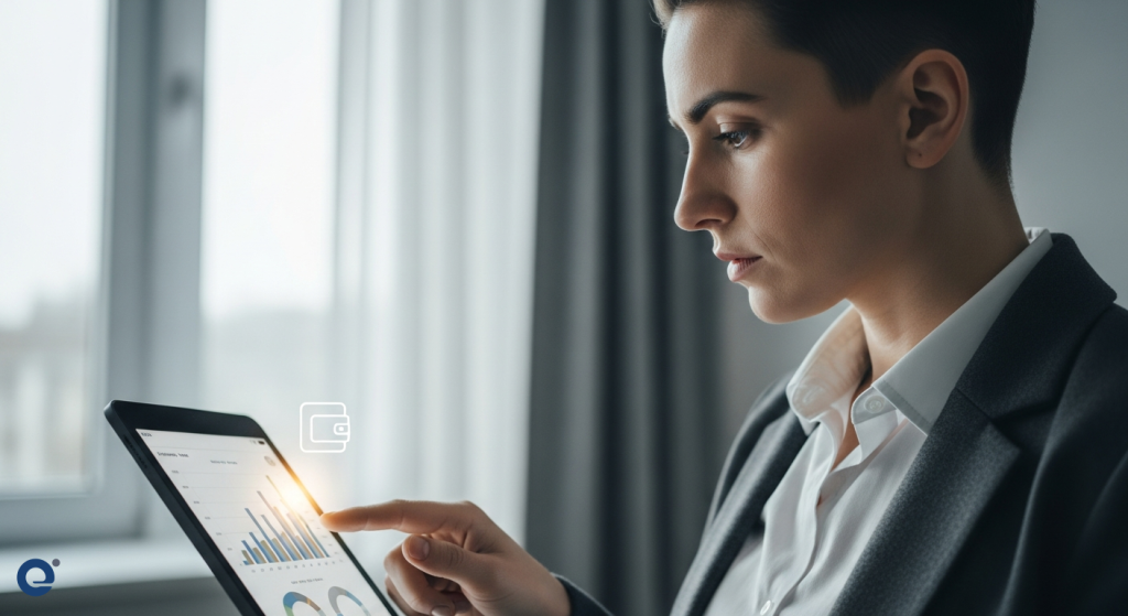 A person carefully reviewing financial data on a secure tablet, with a digital wallet icon visible.