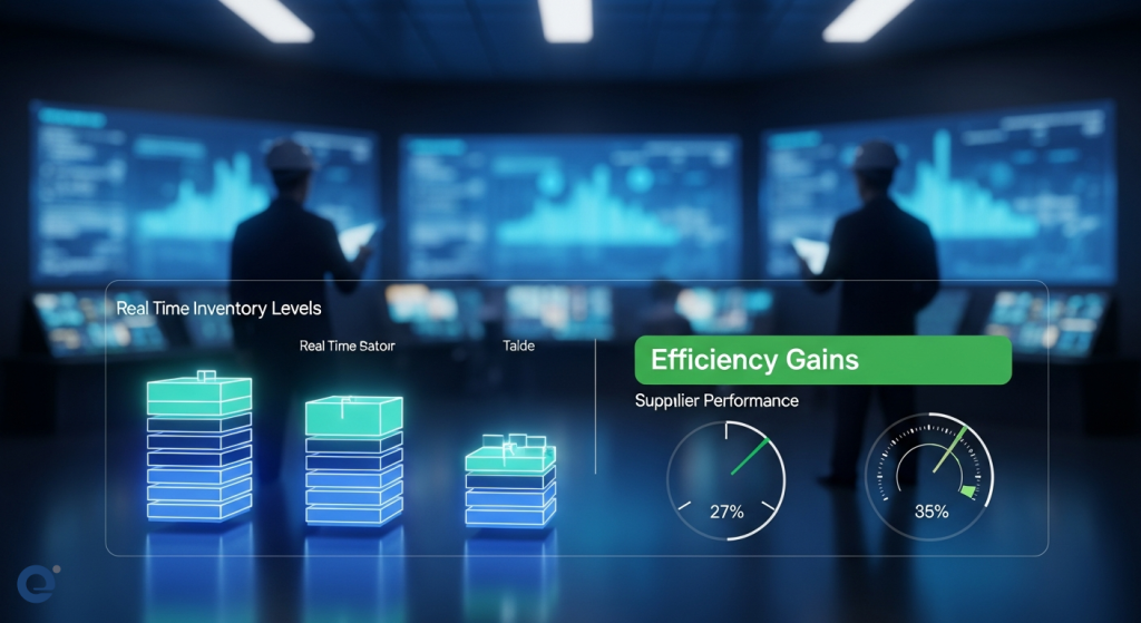A digital dashboard showing real-time inventory levels and supplier performance metrics, highlighting cost savings.
