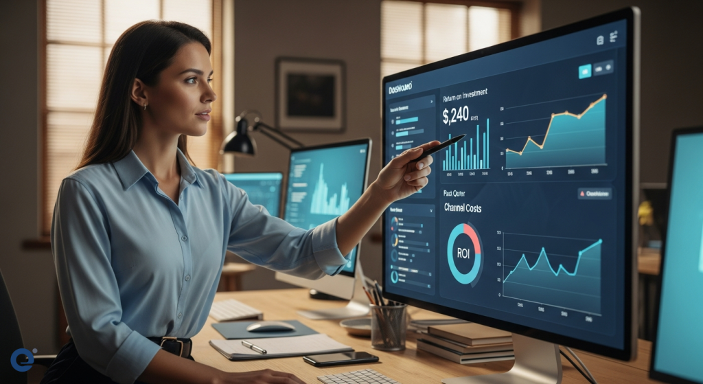 A marketer confidently analyzes a vibrant dashboard, pointing to charts showing rising ROI and declining channel costs.