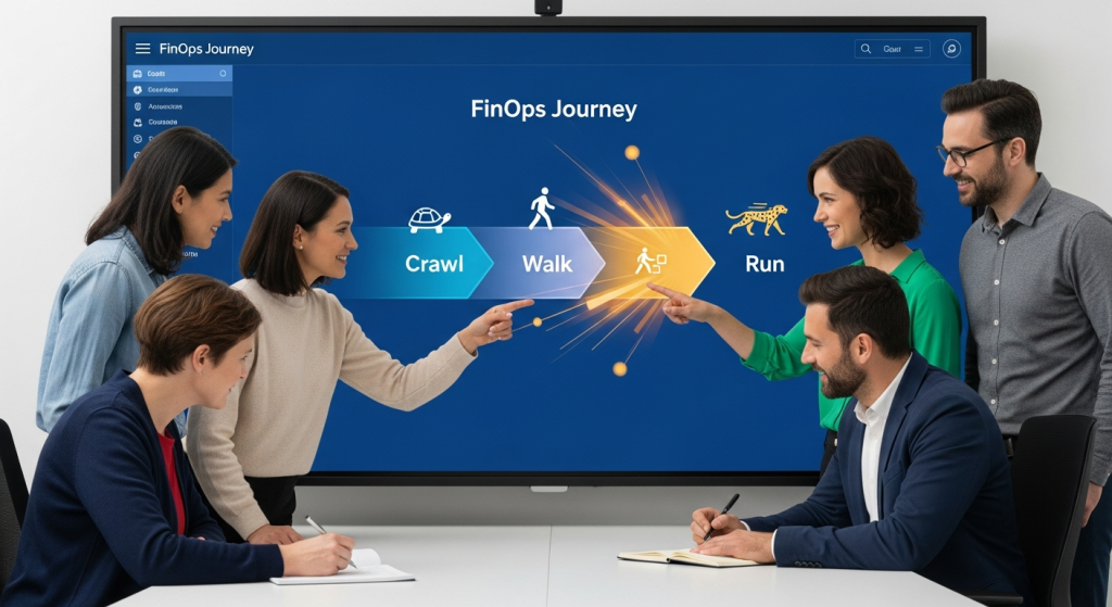 A team collaborates around a digital dashboard, charting their FinOps journey from Crawl to Run.