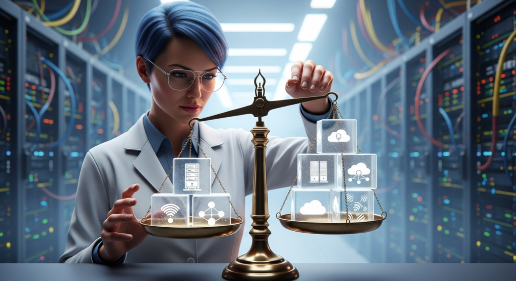 An engineer balances digital blocks representing on-prem servers and public cloud services on a scale.