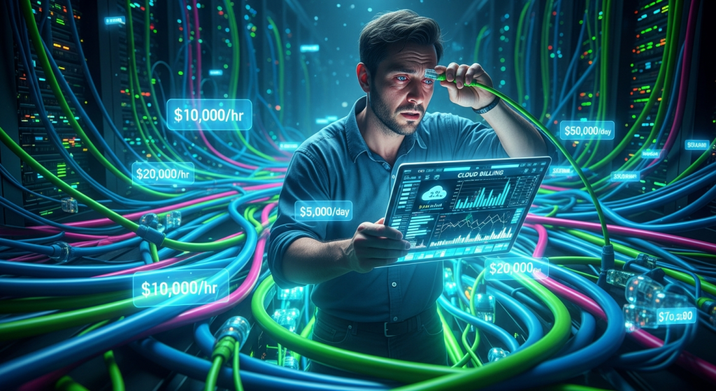 An IT officer navigates a maze of tangled cables, each representing a different, complex cloud bill.