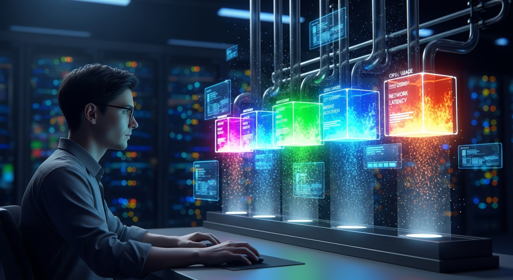 A data analyst watches as a system automatically sorts glowing data blocks into different performance tiers.