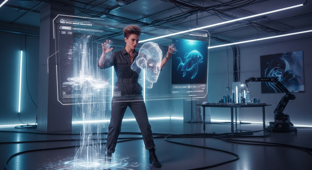 A creative director orchestrates a symphony of AI-generated concepts on a holographic interface in a futuristic studio.