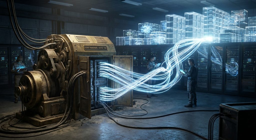 A stylized cloud graphic with interconnected gears, representing the complex machinery of legacy systems being lifted and transformed into a streamlined, modern cloud environment.