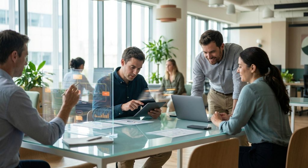 A diverse team collaborating around a digital whiteboard, illustrating efficient resource allocation.