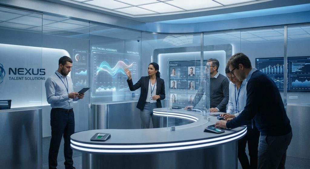A talent acquisition leader confidently selects from a global network of vetted professional profiles on a large, glowing interface.