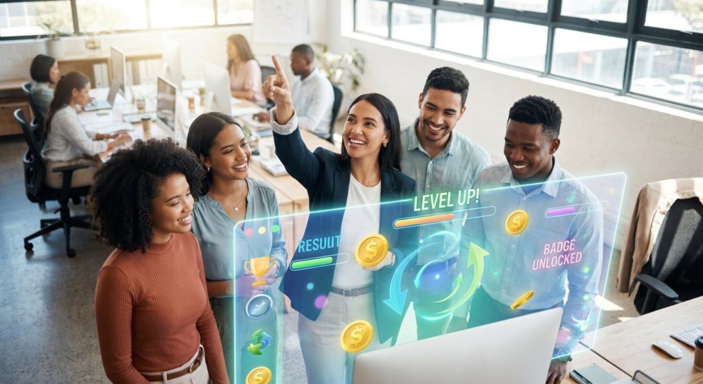 Gamification is the application of game-design elements to non-game contexts. In the workplace, this means using points, badges, and leaderboards to make work more engaging. It is not about turning work into a literal game. Instead, it uses psychological triggers to motivate desired behaviors.